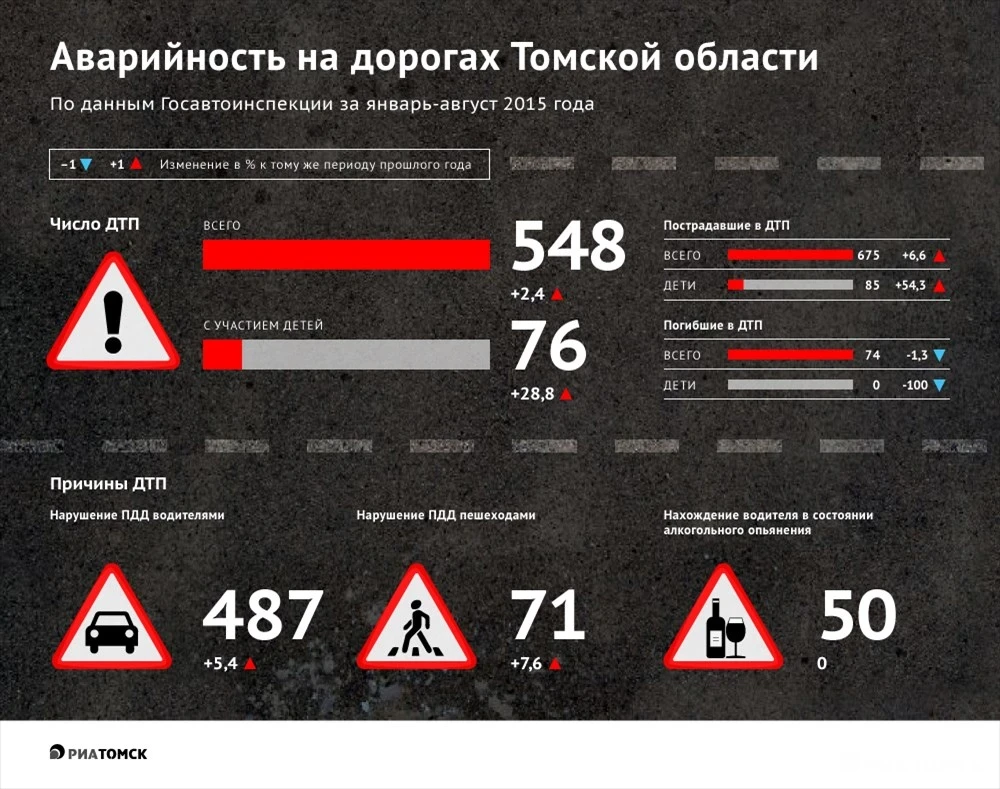 По данным ГИБДД по Томской области, с начала 2015 года в регионе произошло 548 ДТП, в которых погибли 74 и ранены 675 человек. Подробнее - в инфографике РИА Томск.