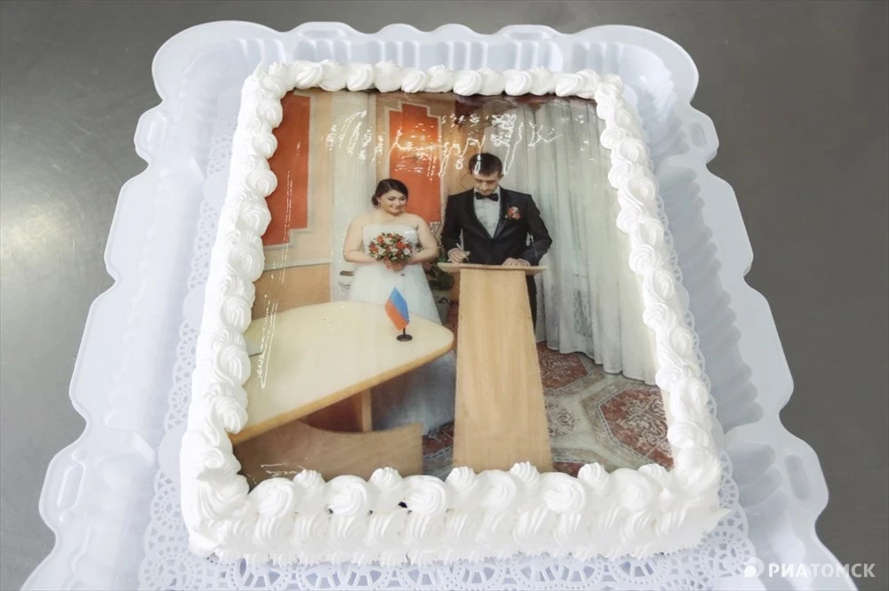 Это один из заказных тортов на годовщину свадьбы. Он выполнен по современной технологии – с помощью фотопечати на рисовой бумаге - и оформлен кремом из взбитых сливок.