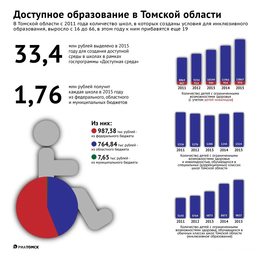 Почти 10 тысяч детей с ограниченными возможностями здоровья в 2015 году получают инклюзивное образование в школах Томской области в рамках программы "Доступная среда". Как реализуется программа в регионе и каковы ее перспективы - узнайте из инфографики РИА Томск.