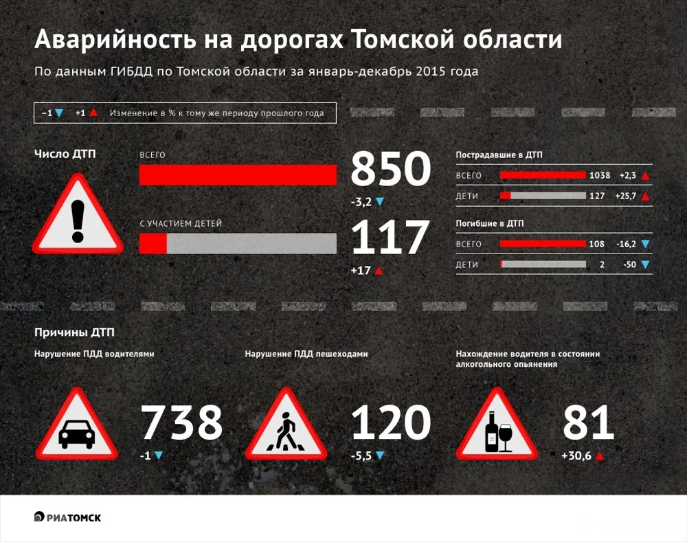 По данным ГИБДД по Томской области, в 2015 году в регионе произошло 850 ДТП, в которых погибли 108 человек, в том числе двое детей.