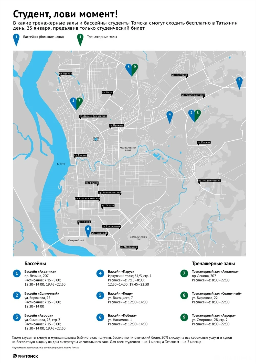 Шесть бассейнов и три тренажерных зала в Татьянин день приглашают томских студентов заняться спортом бесплатно. Подробности – в инфографике РИА Томск.