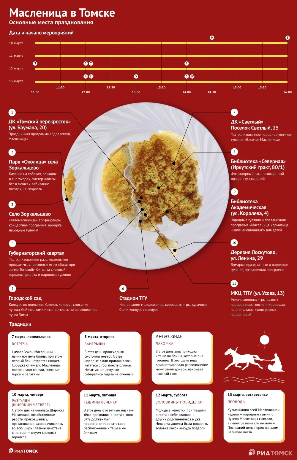 Разные мероприятия запланированы в Томске на Масленичную неделю. Где и в какое время пройдут фольклорные программы, трофи-рейды, народные гулянья и ярмарки  – поможет узнать инфографика РИА Томск.