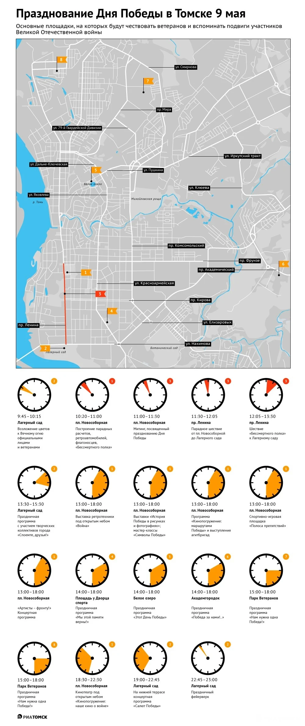 Праздничные мероприятия в честь Дня Победы пройдут в Томске на нескольких площадках. Сориентироваться в них поможет инфографика РИА Томск.