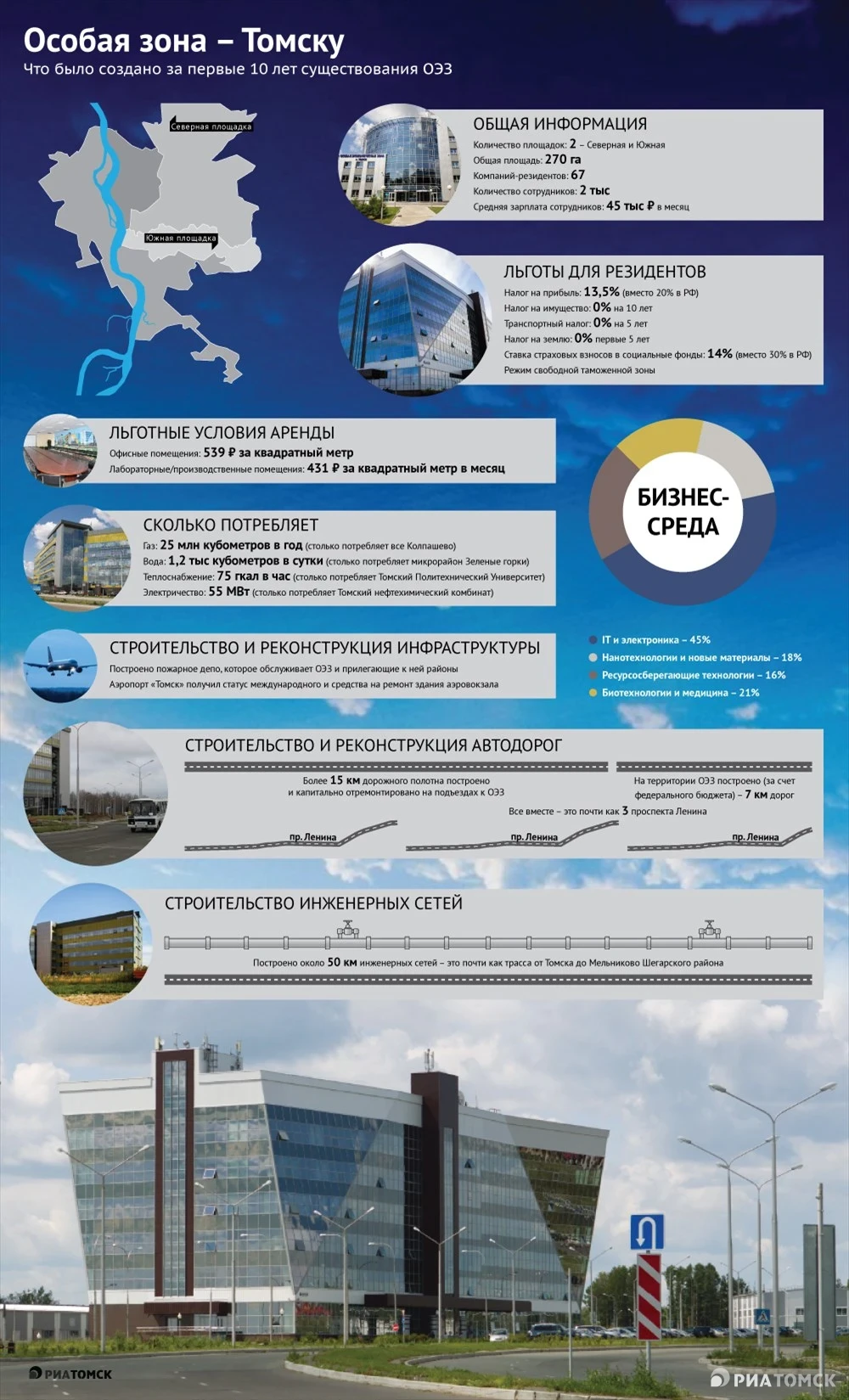 Томская особая экономическая зона 26 апреля отмечает 10-летний юбилей со дня официального открытия. В 2006 году вместо двух площадок ОЭЗ были пустыри и грандиозные планы. Что представляет из себя ОЭЗ технико-внедренческого типа "Томск" сейчас и что она дала городу – в инфографике РИА Томск.