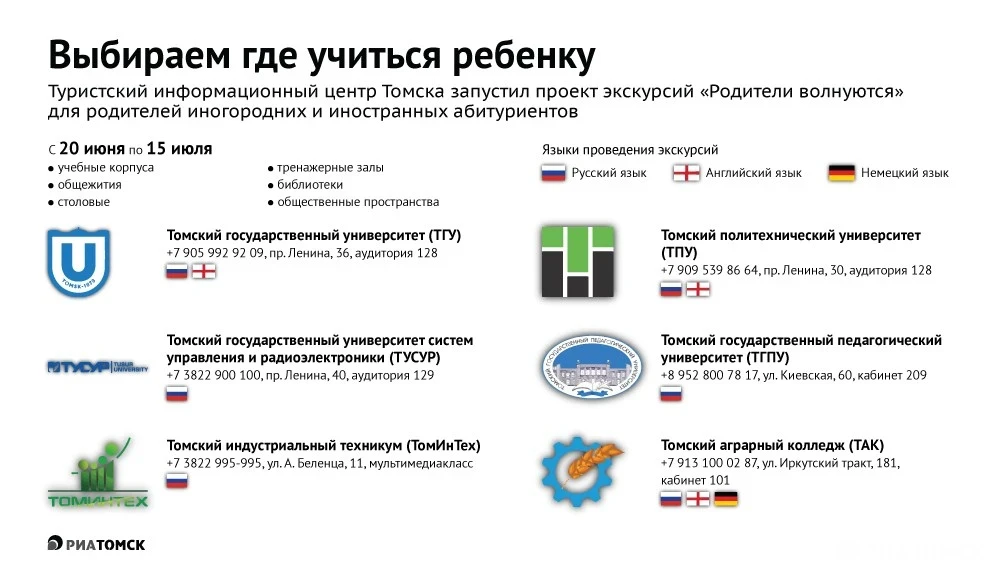 Родители абитуриентов смогут ознакомиться с условиями проживания и обучения в Томске. Бесплатные экскурсии по учебным заведениям будут проводить студенты в период работы приемных комиссий – с 20 июня по 15 июля.