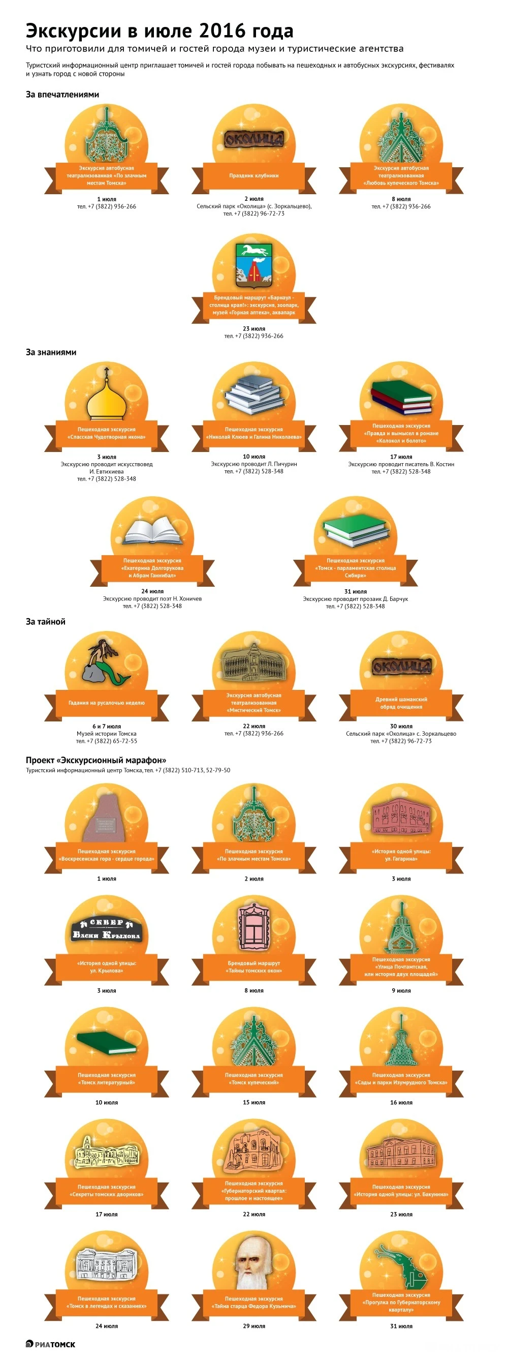 Жители и гости Томска могут оригинально и с пользой провести июльские выходные, а также будние дни, не покидая пределы Томской области. Туроператоры и музеи Томска подготовили более двух десятков автобусных и пешеходных экскурсий. Подробнее – в инфографике РИА Томск.