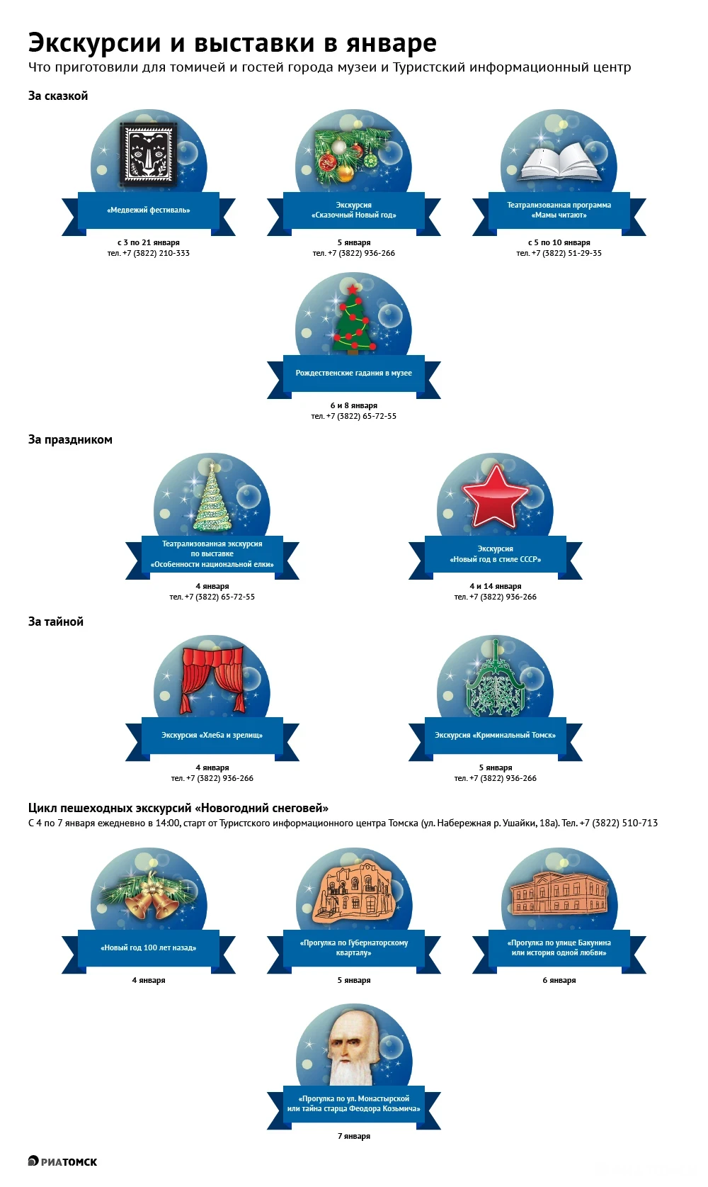 Жители и гости Томска могут оригинально и с пользой провести новогодние праздники, не покидая пределы Томской области. Туристский информационный центр предлагает более двух десятков интересных предновогодних мероприятий. Подробнее – в инфографике РИА Томск.