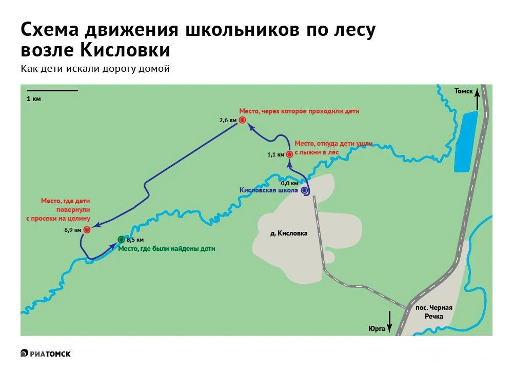 Десять четвероклассников и учитель Кисловской школы провели в лесу несколько часов, заблудившись 12 января во время урока физкультуры на лыжах. На улице было около 15 градусов мороза. По координатам, предоставленным жителем деревни Евгением Степаняном, РИА Томск составило схему передвижения детей.