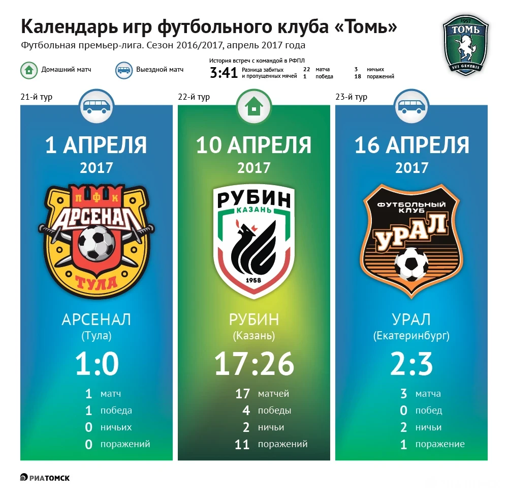Очередной матч чемпионата РФПЛ "Томь" проведет на выезде 1 апреля: томичи сыграют с тульским "Арсеналом". С кем еще встретятся футболисты "Томи" в апреле – подскажет инфографика РИА Томск.