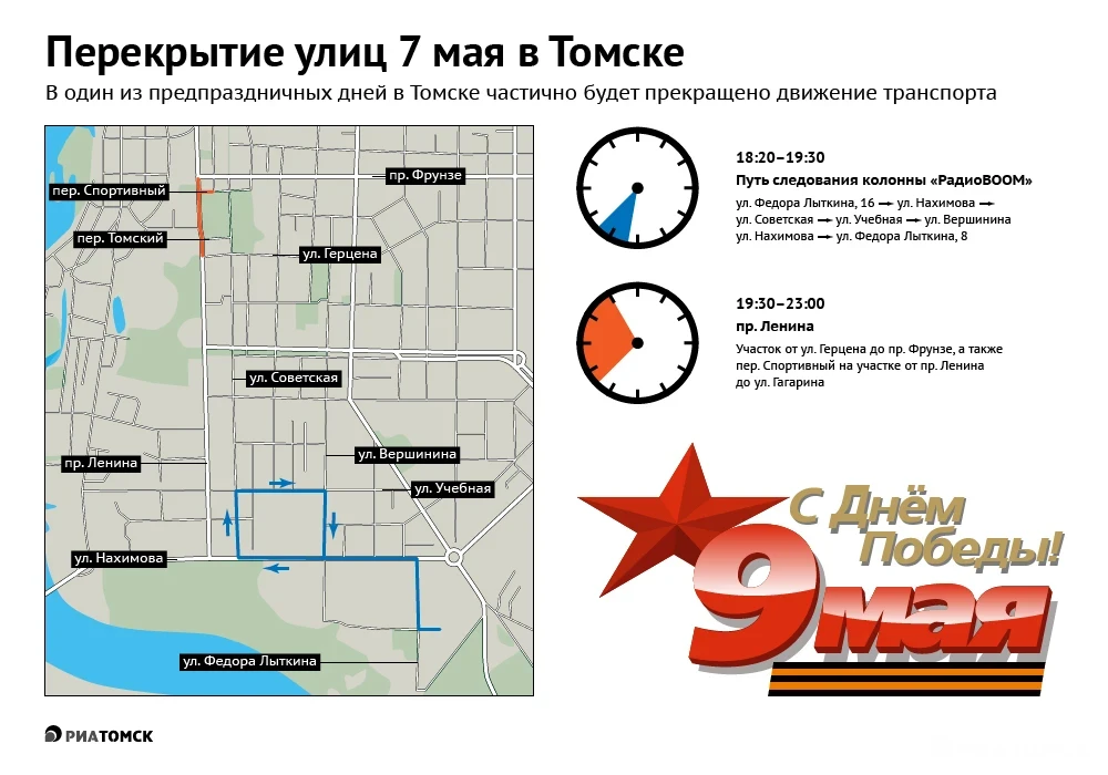 Движение транспорта будет перекрыто на нескольких улицах Томска 7 мая в связи с проведением генеральной репетиции парада Победы, а также шествия "РадиоВООМ", посвященного Дню радио. Какие именно улицы и в какое время будут недоступны автомобилистам – в инфографике РИА Томск.
