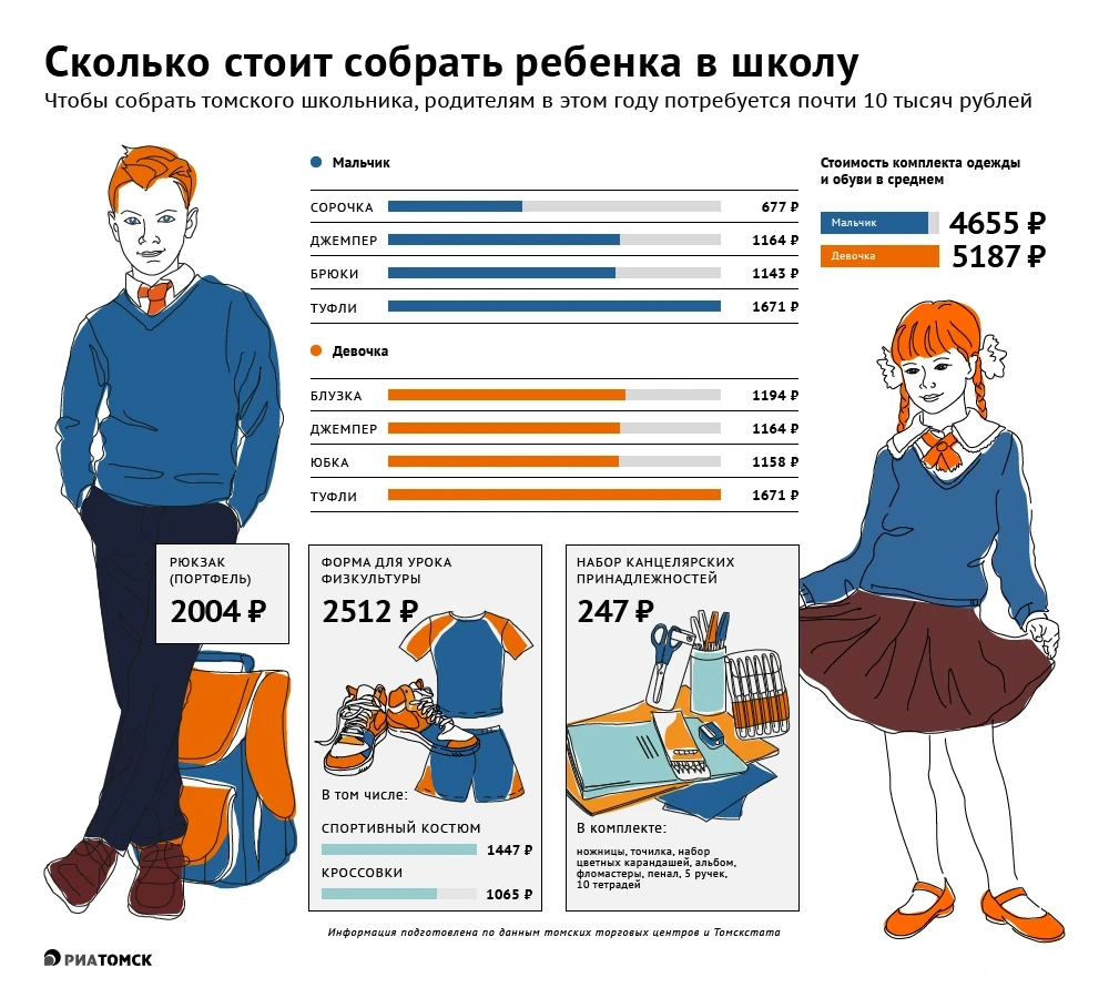 Сборы в школу в 2017 году обойдутся родителям учеников почти в 10 тысяч рублей – такие данные предоставил Томскстат. Что именно нужно купить и цены на школьный ассортимент в томских магазинах – в инфографике РИА Томск.