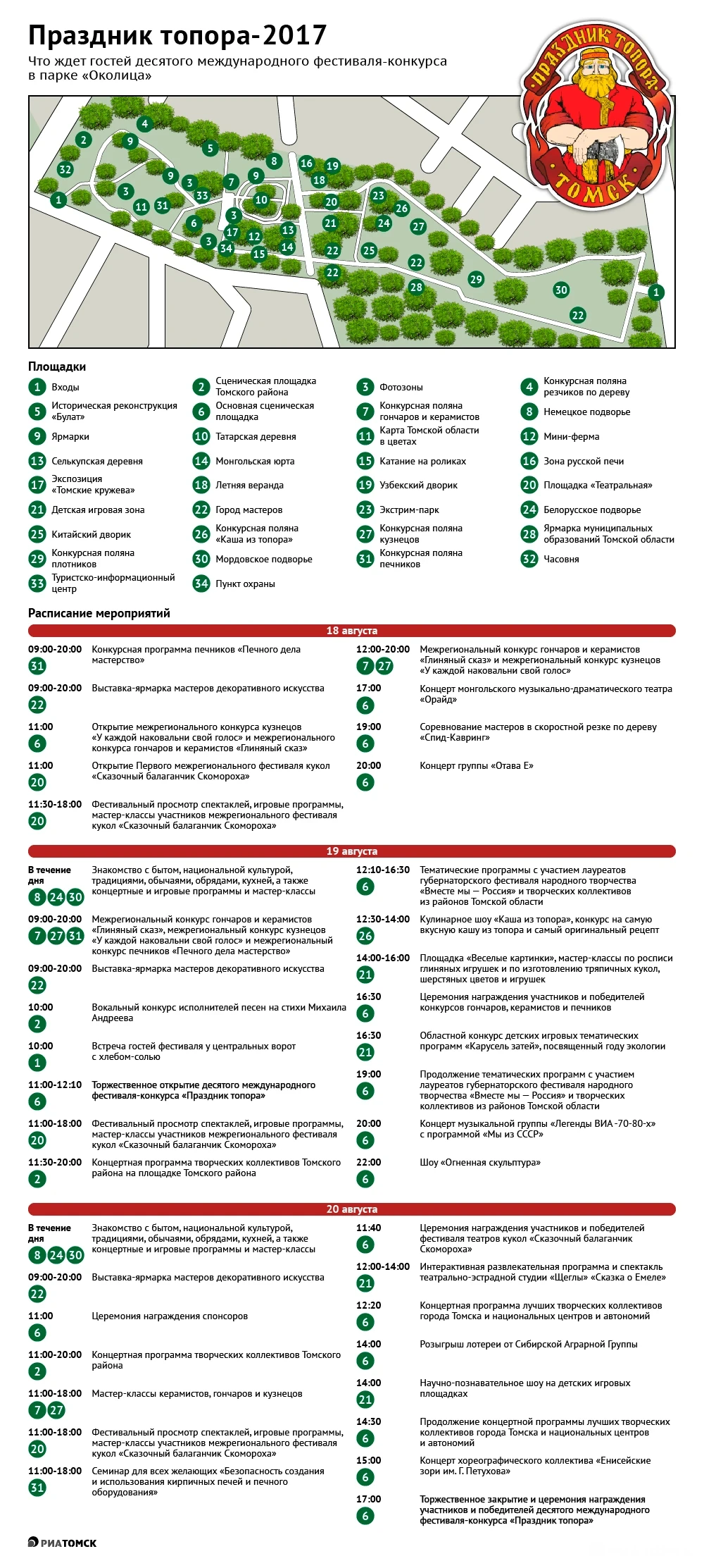 Техническое открытие "Праздника топора – 2017" состоялось в среду парке "Околица" под Томском. Основные события фестиваля запланированы на 18, 19 и 20 августа. Выбрать интересующие мероприятия и посмотреть, на каких именно площадках они пройдут, поможет инфографика РИА Томск.