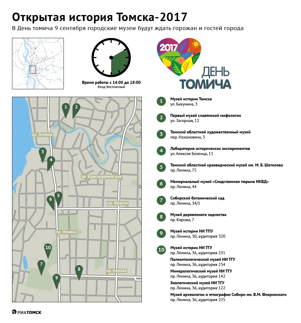 Многие томские музеи в День томича, 9 сентября, будут принимать посетителей бесплатно. Желающие смогут увидеть картины известных мастеров, скелет мамонта, тюрьму НКВД и многое другое. Какие музеи участвуют в праздничной акции – узнайте из инфографики РИА Томск.