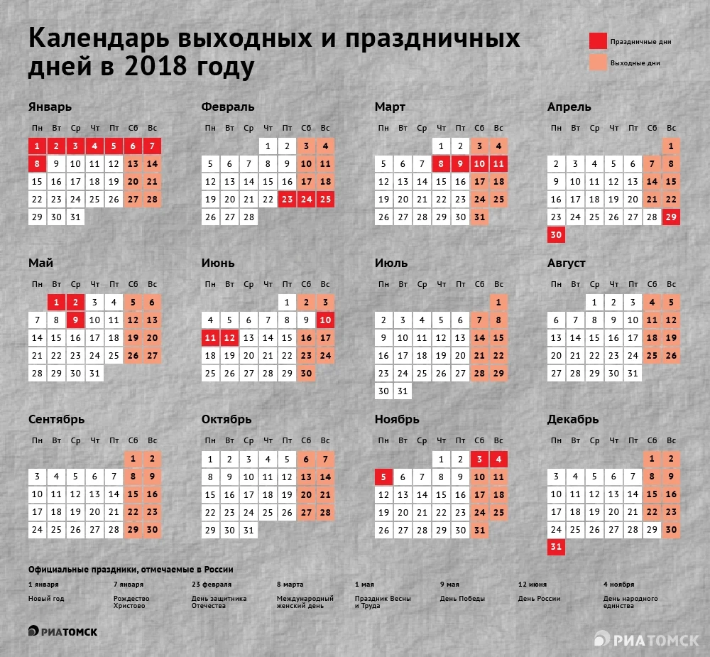 Россияне будут отдыхать больше недели на Новый год, три дня подряд в феврале и четыре в марте в 2018 году. На какие дни выпадут выходные в другие месяцы – узнайте из инфографики РИА Томск.