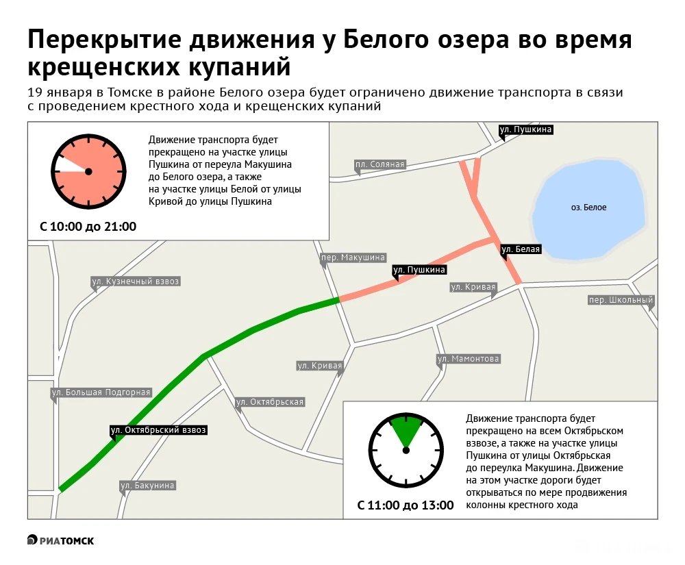 Крещенские купания будут организованы в Томске на Белом озере, в связи с чем в пятницу, 19 января, будут закрыты для движения транспорта прилежащие улицы. Подробнее – узнайте из инфографики РИА Томск.