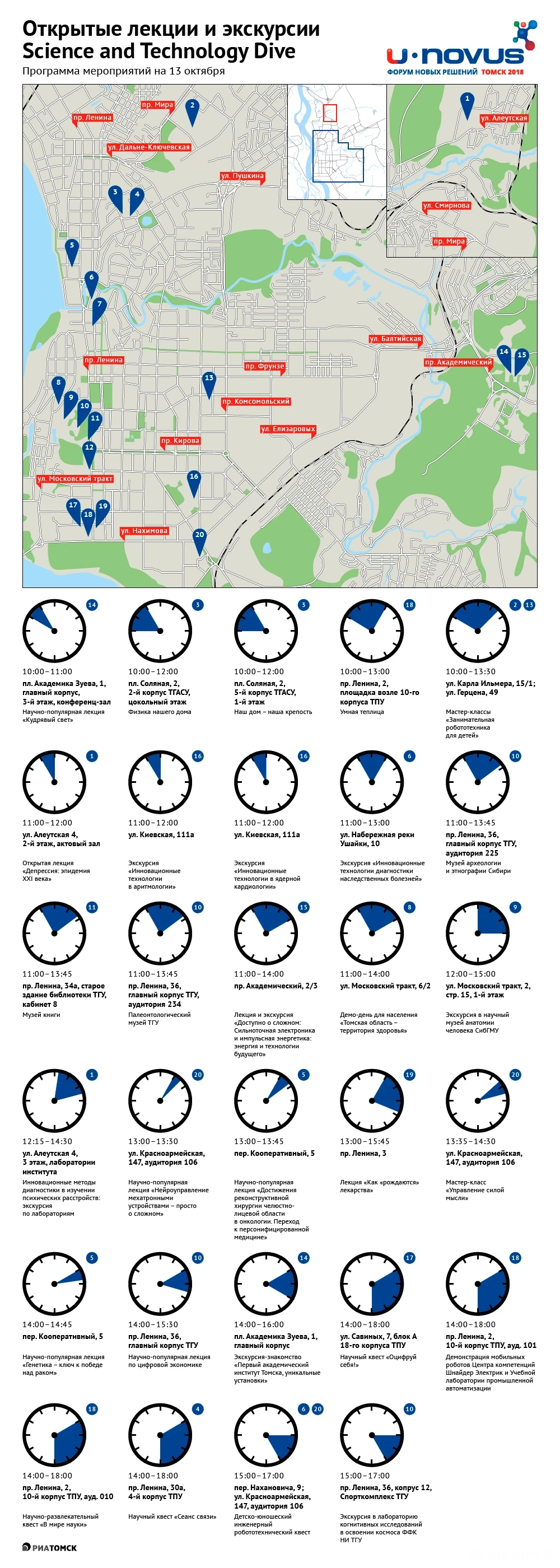 Серия научно-популярных лекций и экскурсий Science&Technology Dive запланирована в Томске в субботу, 13 октября, в рамках форума U-NOVUS. Всего гостей примут 29 площадок, в том числе в томских вузах и НИИ. Где можно побывать и на что посмотреть – в инфографике РИА Томск.