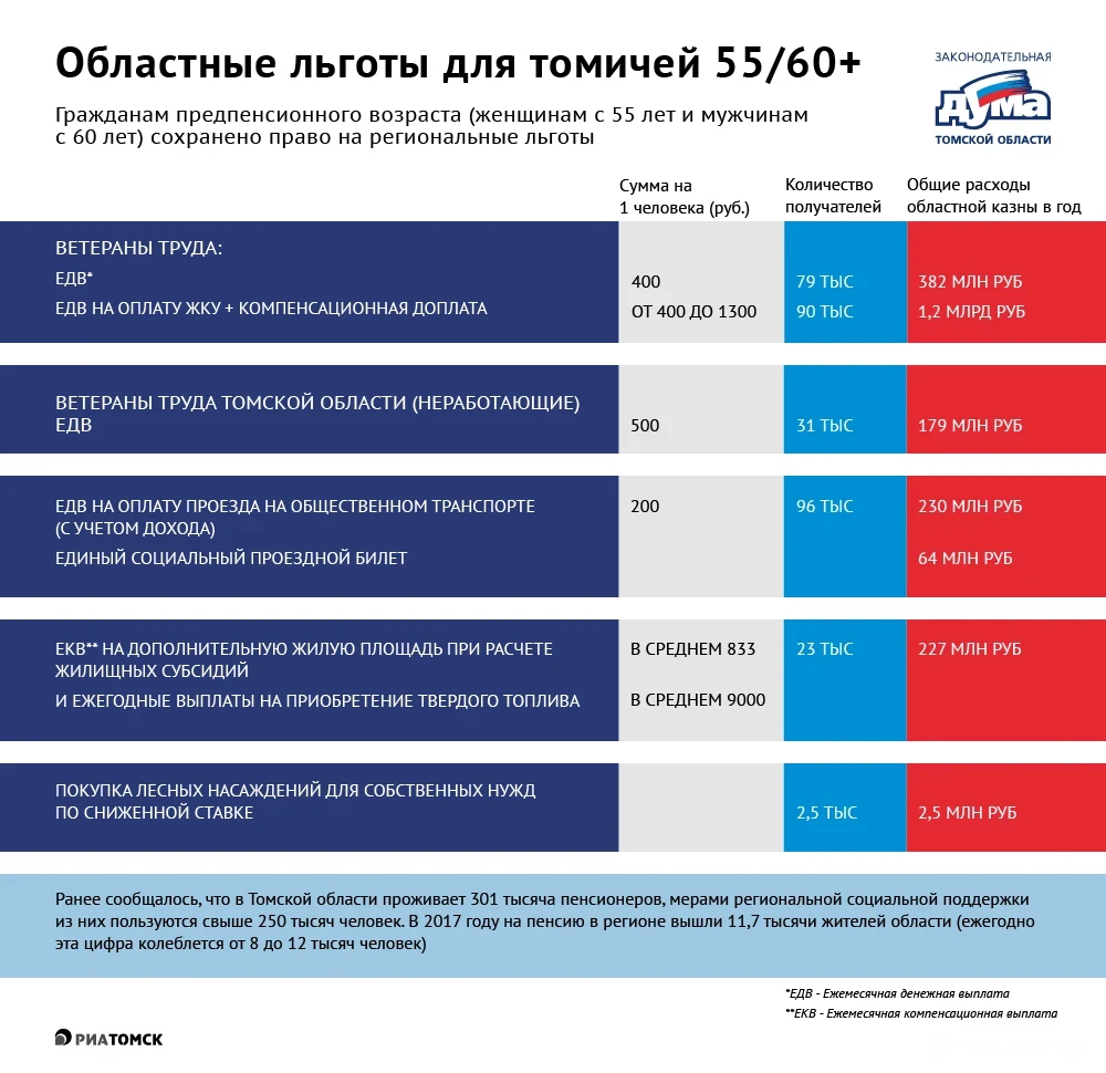 Законодательная дума Томской области своим решением сохранила для жителей региона старше 55-60 лет все льготы, на которые они могли претендовать после выхода на пенсию. Каков объем самых значимых мер соцподдержки – в инфографике РИА Томск.