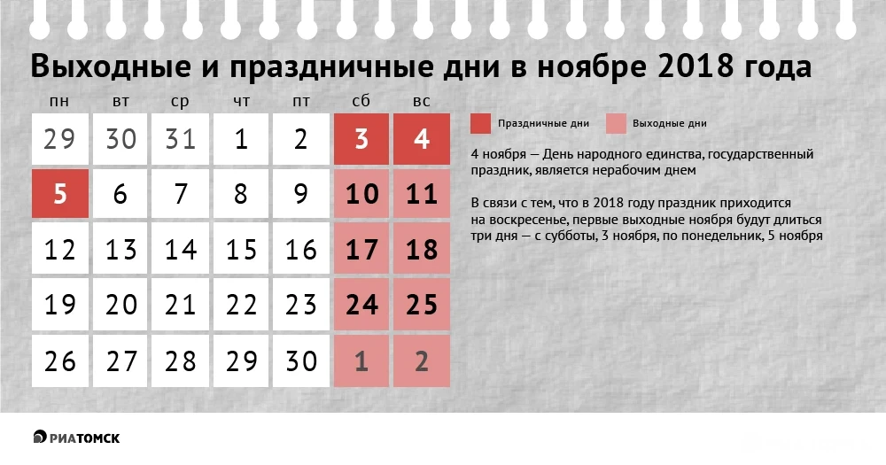 День народного единства, который ежегодно отмечается 4 ноября, в 2018 году выпадает на воскресенье, поэтому россияне будут отдыхать три дня подряд. Когда именно – узнайте из инфографики РИА Томск.