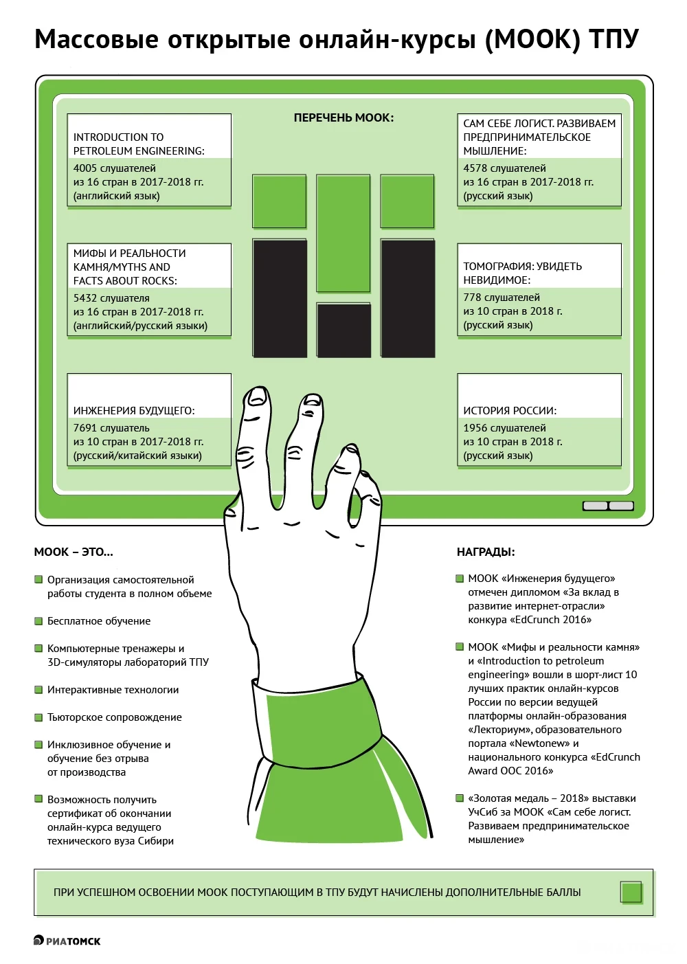 Томский политехнический университет (ТПУ) проводит для школьников и студентов массовые открытые онлайн-курсы (МООК). Об их направлениях – в инфографике РИА Томск.