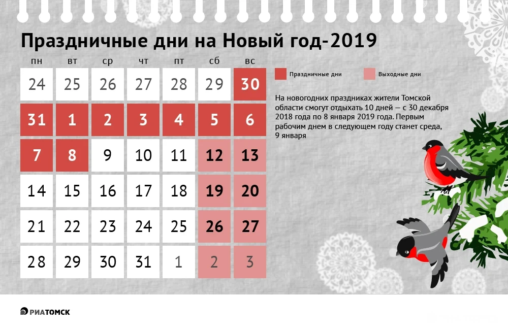 Томичи, как и все жители России, в предстоящие новогодние праздники будут отдыхать 10 дней. Когда именно – узнайте из инфографики РИА Томск.