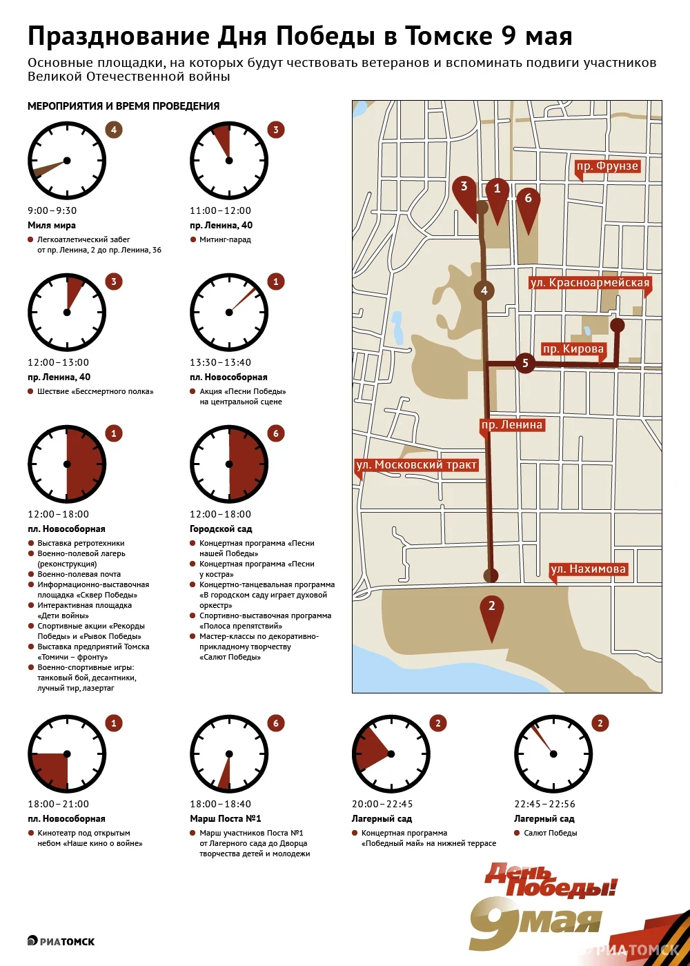 Легкоатлетический забег, Парад Победы и шествие "Бессмертного полка", а также праздничные концерты, выставка военной ретротехники и другие мероприятия пройдут в Томске в День Победы. Сориентироваться по времени и не пропустить самые важные события поможет инфографика РИА Томск.