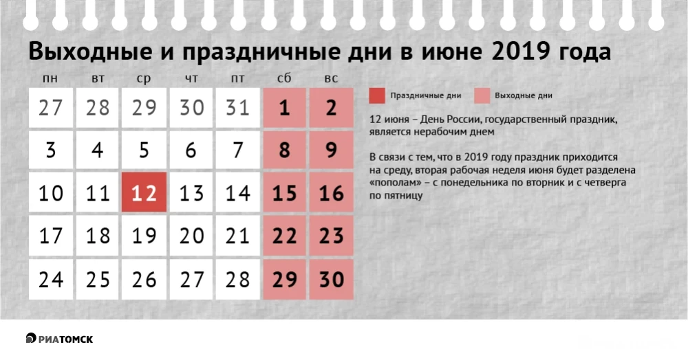 День России традиционно является нерабочим днем, поэтому в июне у россиян одним выходным будет больше. Когда – узнайте из инфографики РИА Томск.