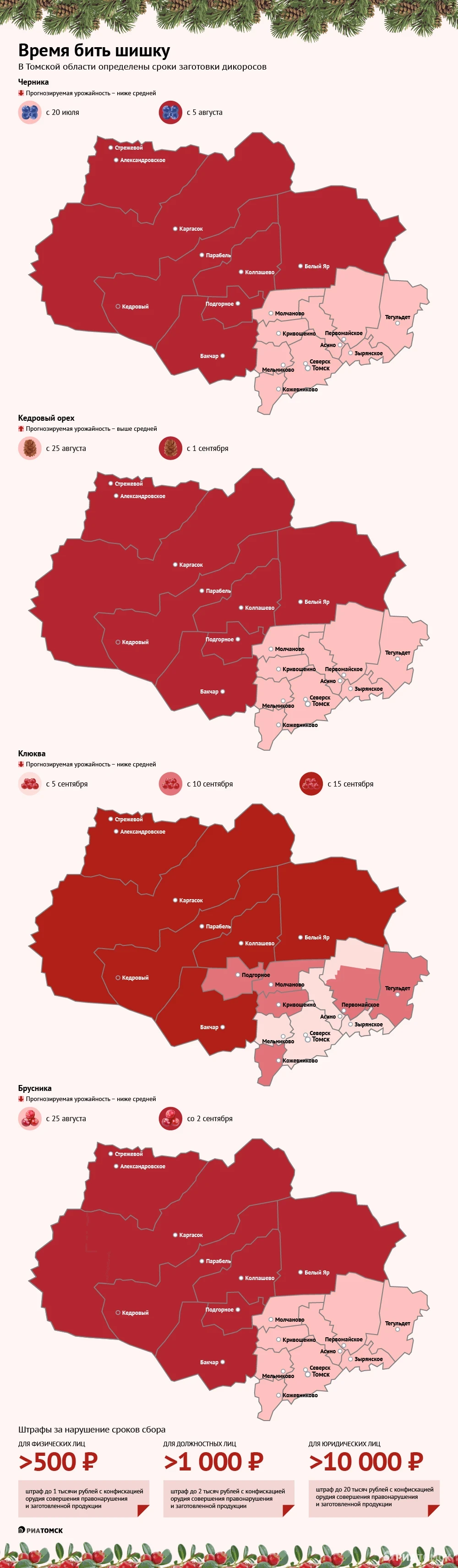 Середина лета – самое время задуматься о заготовке дикоросов. Когда и куда томичи могут отправиться за черникой, брусникой и шишками и что грозит за их несвоевременный сбор – в инфографике РИА Томск.