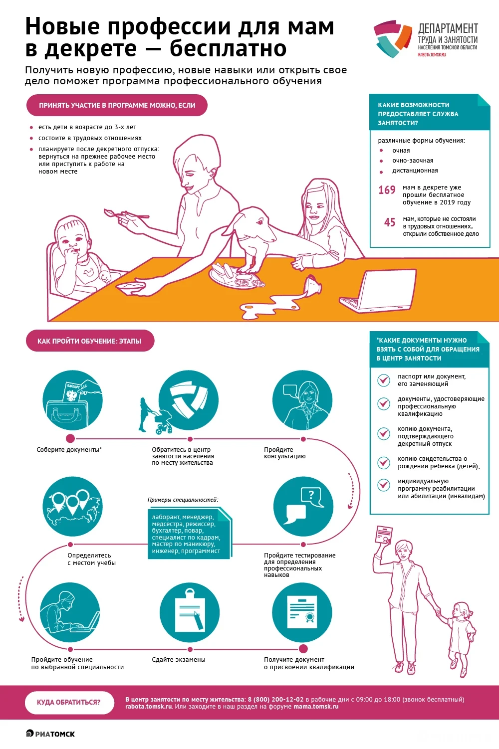 Мамы Томска с детьми до 3-х лет могут получить новую профессию или повысить свою квалификацию бесплатно. Обучение проводит департамент труда и занятости региона. Как это сделать – узнайте из инфографики РИА Томск.