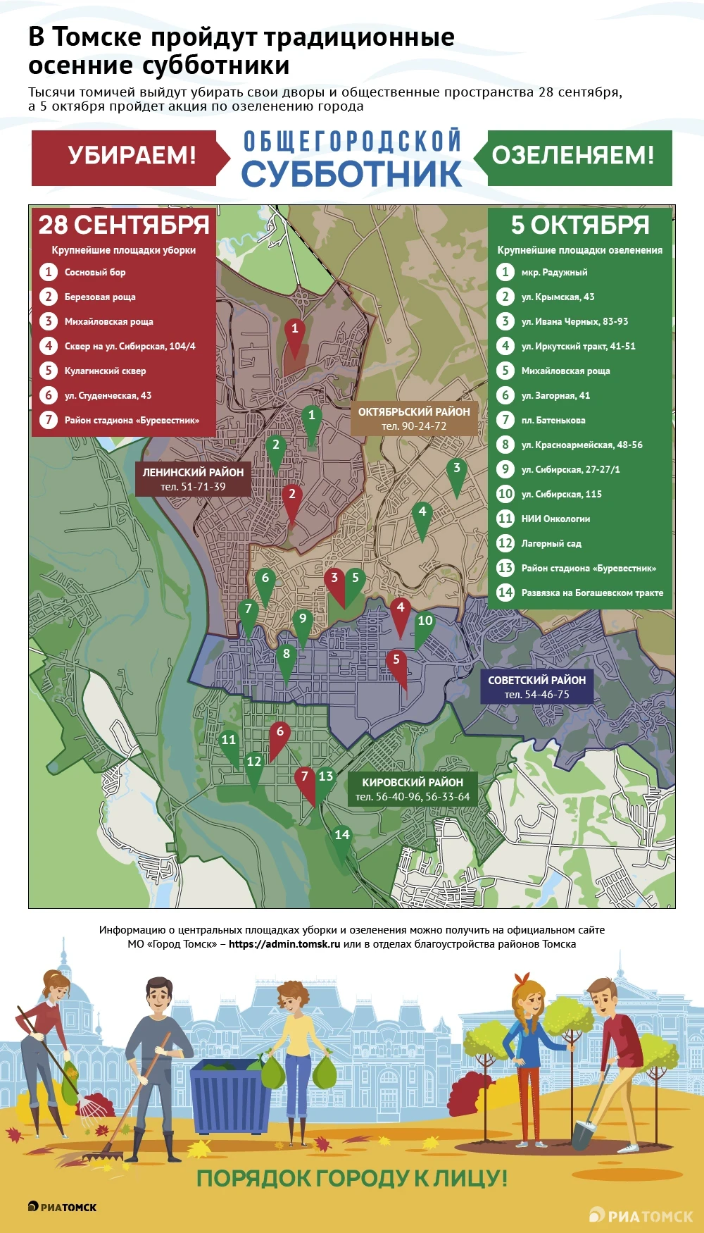 Общегородской субботник состоится в Томске 28 сентября. Основные работы пройдут в парках и скверах, а также на дворовых территориях. Через неделю – 5 октября – пройдет масштабная акция по озеленению города. Крупнейшие площадки уборки и озеленения – в инфографике РИА Томск.