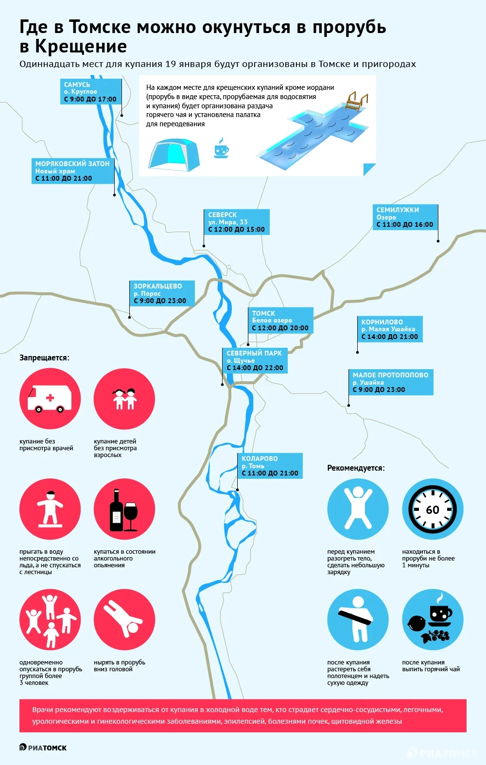 Больше десятка купелей будут организованы в Крещение (19 января) в Томске и пригороде. Где и в какое время можно будет окунуться в прорубь, а также рекомендации специалистов, как сделать это без ущерба для здоровья, – в инфографике РИА Томск.