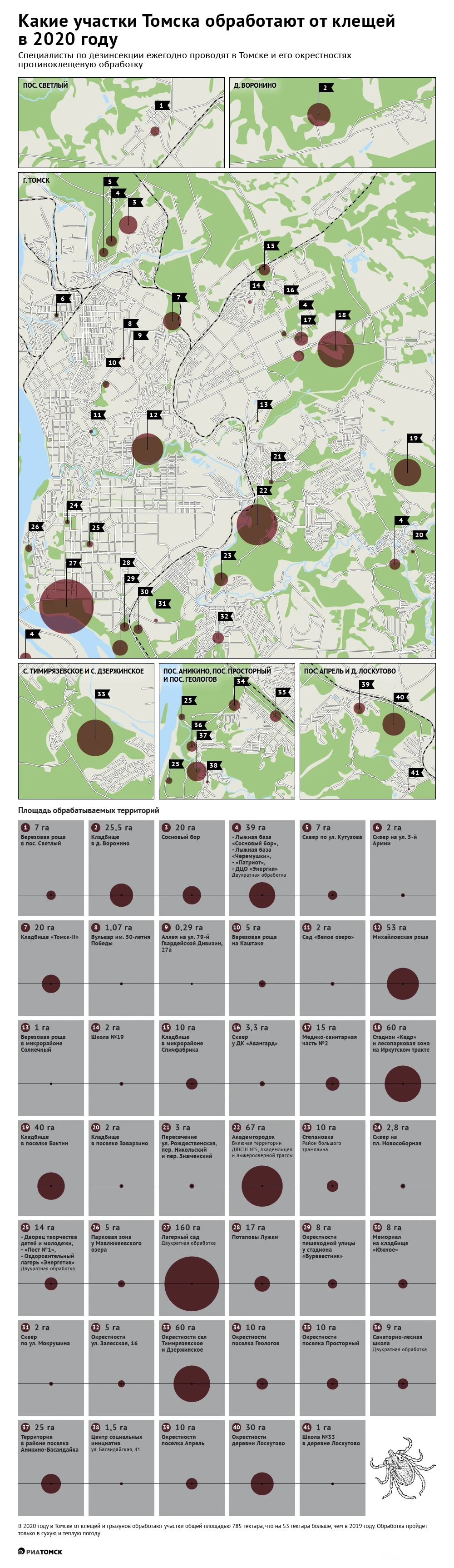 Специалисты уже приступили к противоклещевой обработке зеленых зон Томска. В этом году работы планируется провести на 40 с лишним объектах, где именно – на инфографике РИА Томск.