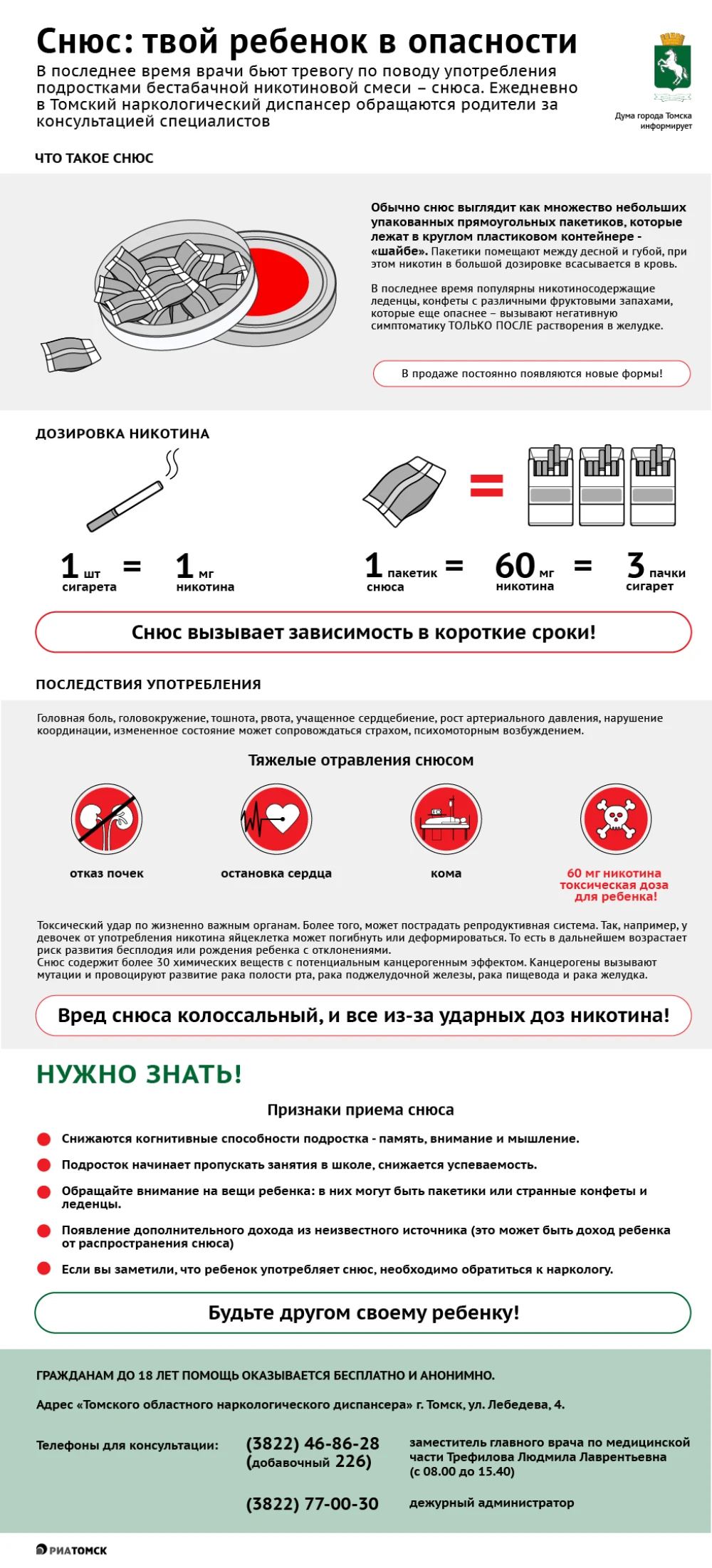 Окончание школьного года, как и дистанционное обучение, на которое временно перешли наши дети, совсем не исключает таких проблем, как распространение снюса среди детей и подростков. Что нужно знать родителям об этой опасности, чтобы помочь своему ребенку – в инфографике РИА Томск.