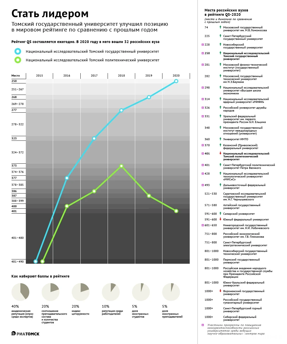 Агентство Quacquarelli Symonds (QS) опубликовало очередной рейтинг лучших мировых вузов. В 2020 году Томский госуниверситет поднялся в нем на 18 строчек и занял 250-е место среди сильнейших университетов. Томский политех же потерял 14 позиций. Подробнее о распределении мест в рейтинге – в инфографике.