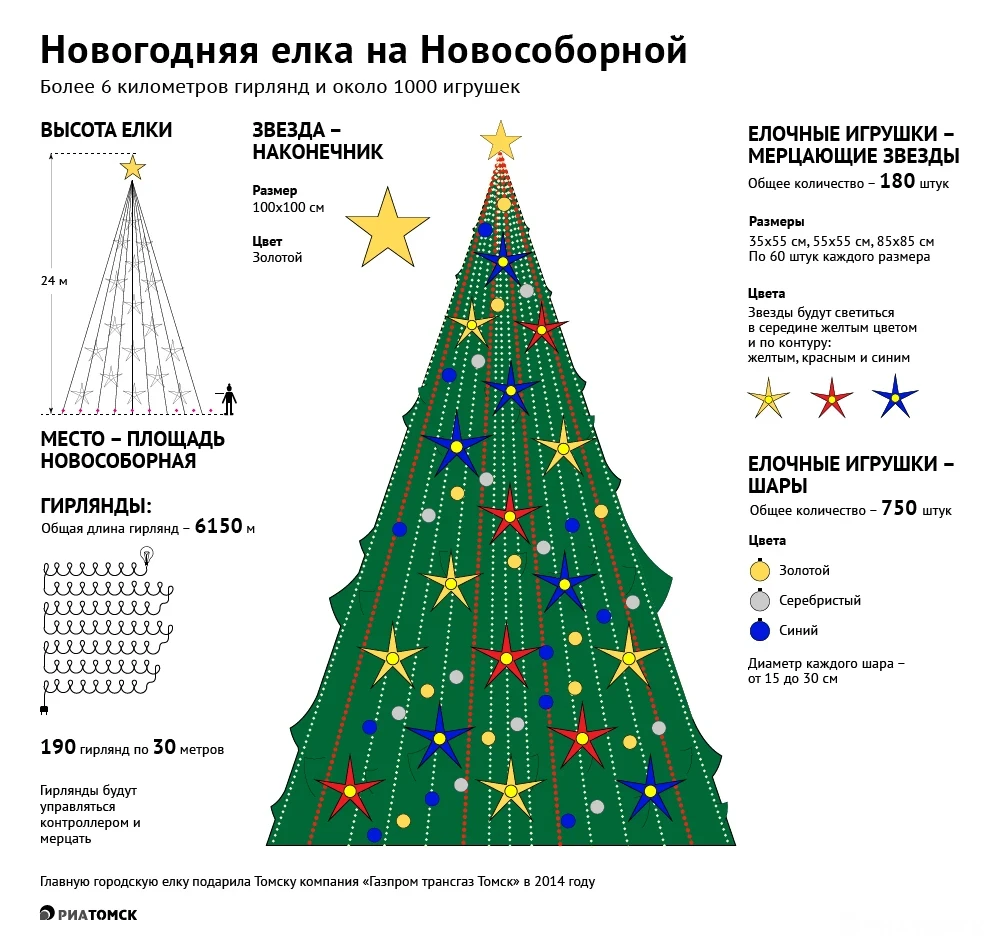 Искусственная новогодняя елка высотой 24 метра будет установлена на площади Новособорной в Томске к 10 декабря. Ее украсят 6 километров гирлянд, а также разноцветные шары и светящиеся звезды. Подробности – в инфографике РИА Томск.