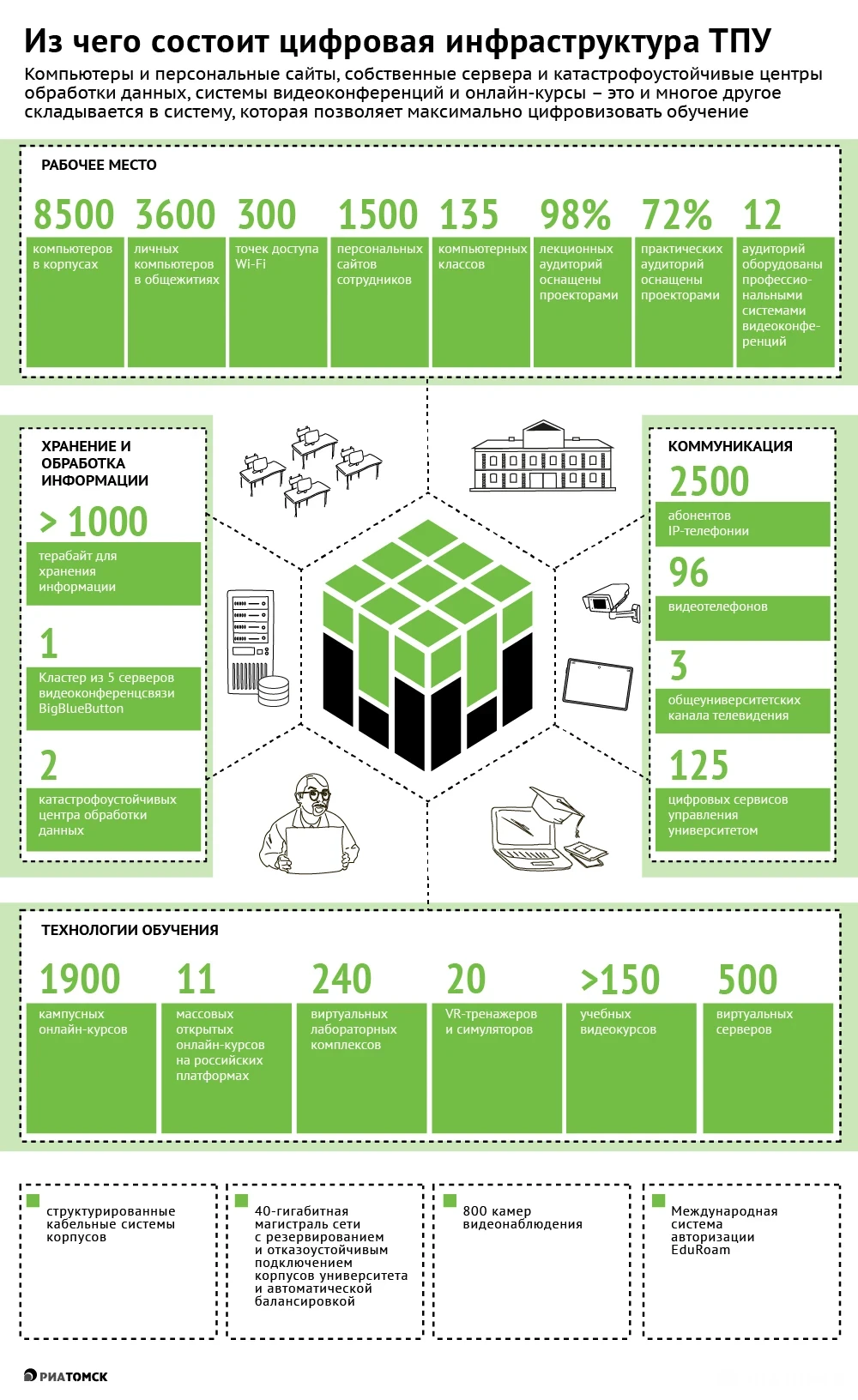 Более 150 полноценных цифровых систем и сервисов работают в Томском политехе. Благодаря тому, что инфраструктура развивалась последние 10 лет, переход "в дистант" прошел совершенно безболезненно. Суммарный объем хранящихся данных сегодня около 450 Тб, а всего объем системы хранения – почти 1 ПБайт.
