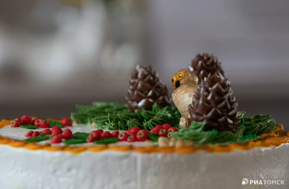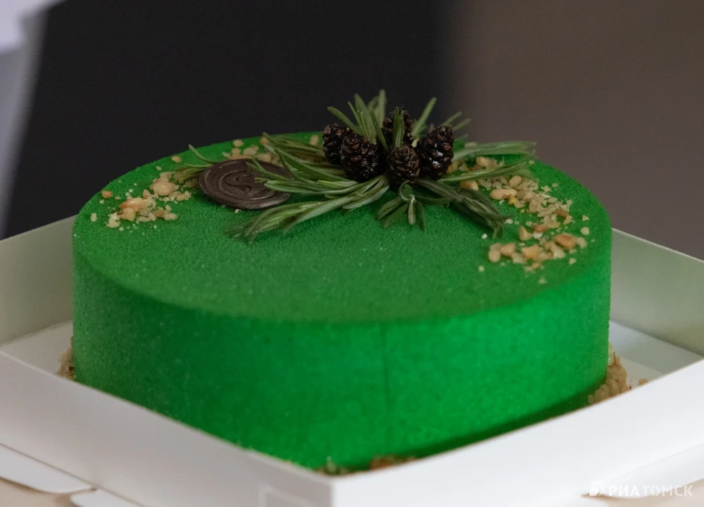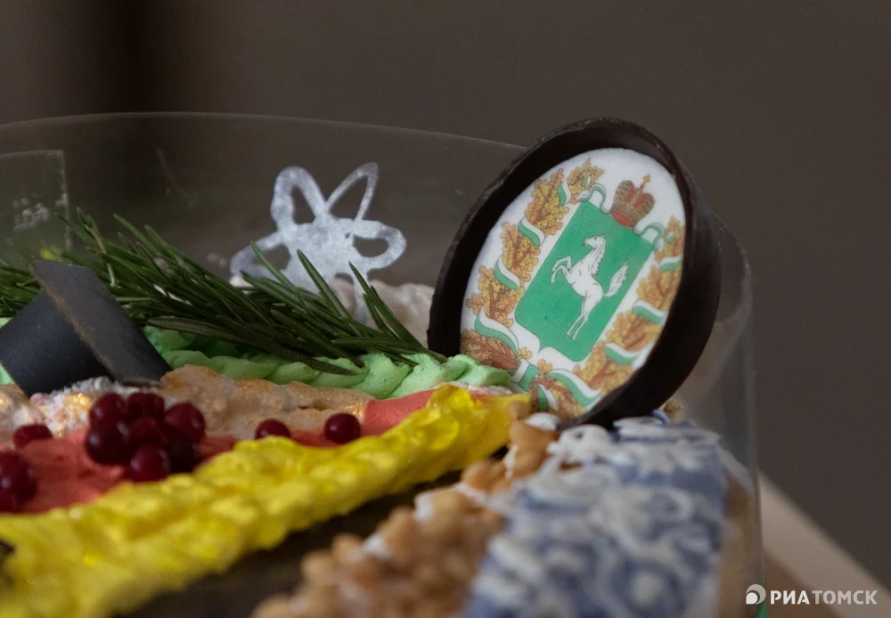 Создатели этого торта попытались отобразить буквально все символы региона: деревянное зодчество, дикоросы, томскую нефть, атомную промышленность и, конечно, студенческое сообщество.