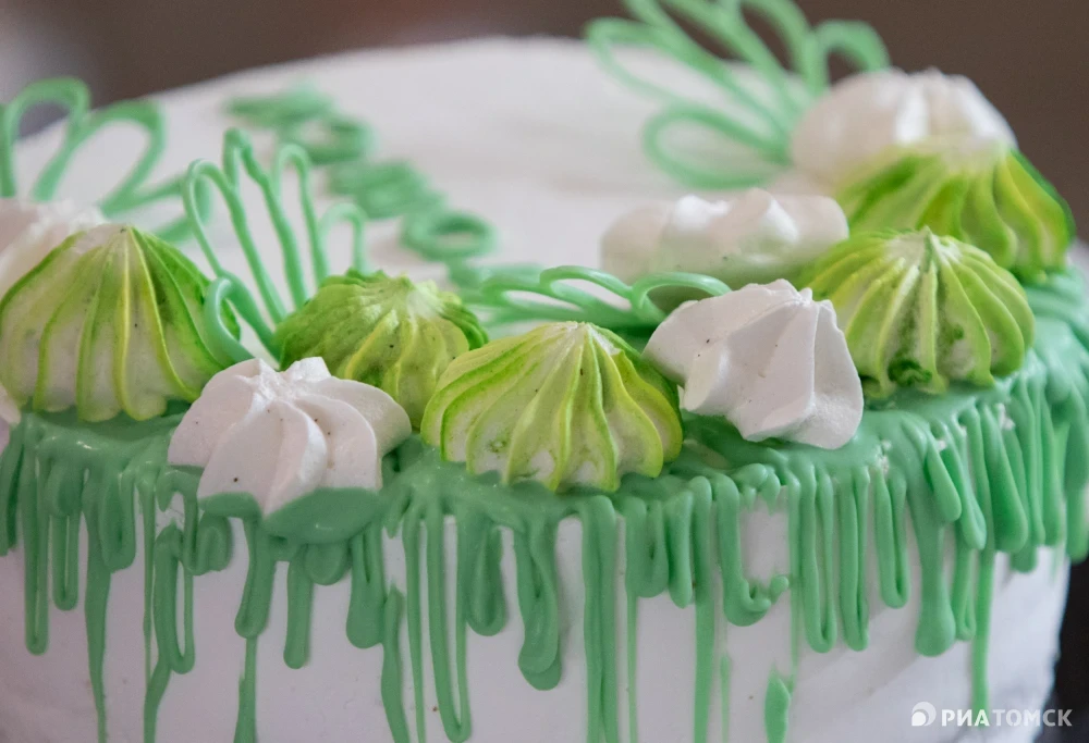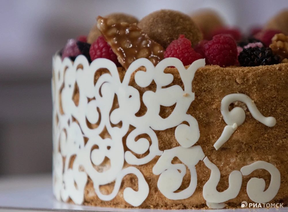 Кондитер из "Багета-омлета" разработала рецепт на основе медового торта, украсив его вензелями, которые символизируют резьбу на деревянных домах Томска.
