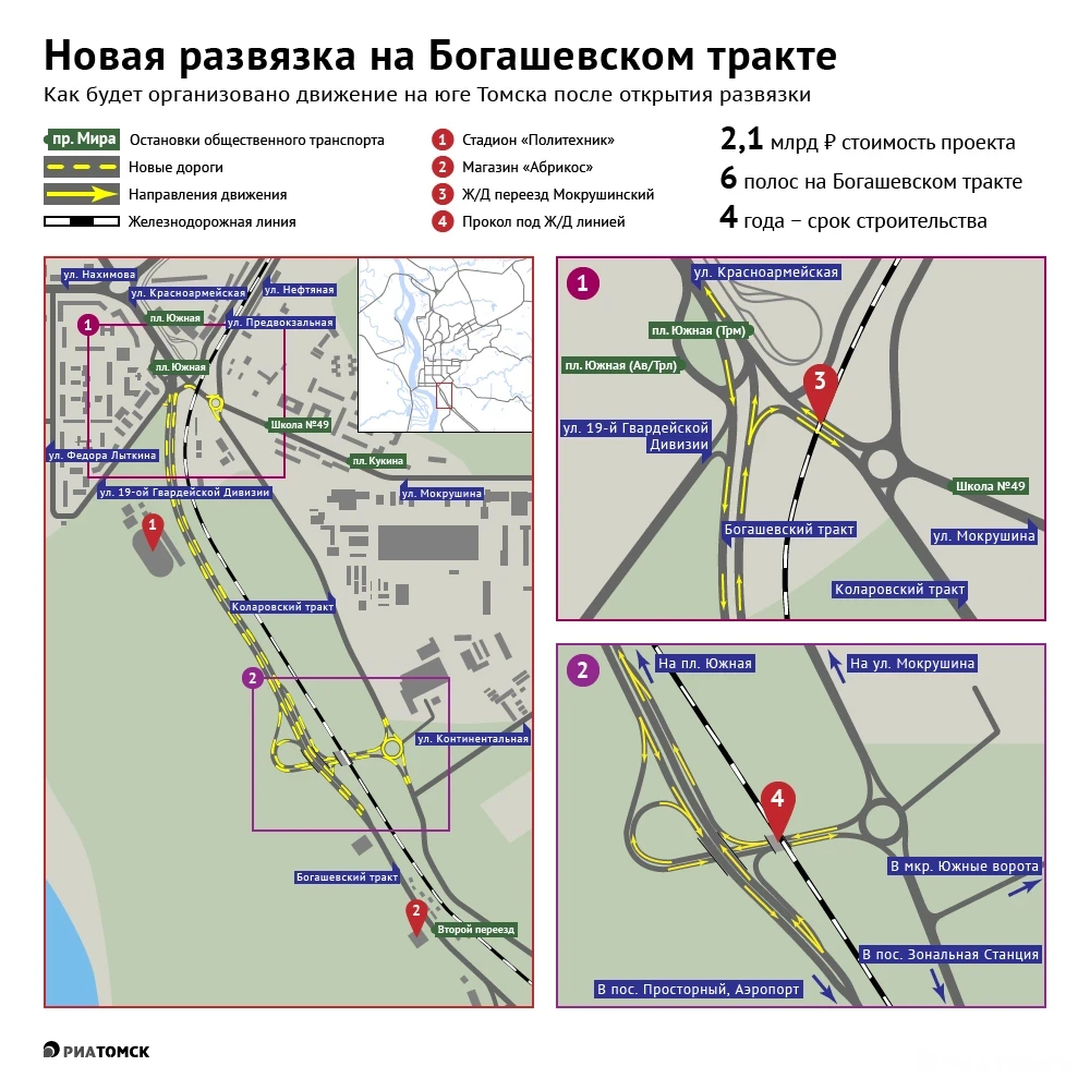 Движение по транспортной развязке между Богашевским и Коларовским трактами с "проколом" под железной дорогой открылось в Томске в пятницу. При этом изменилась и схема проезда с площади Южной на улицу Мокрушина – разворот на Богашевском тракте закрыт. Наглядно – в инфографике РИА Томск.