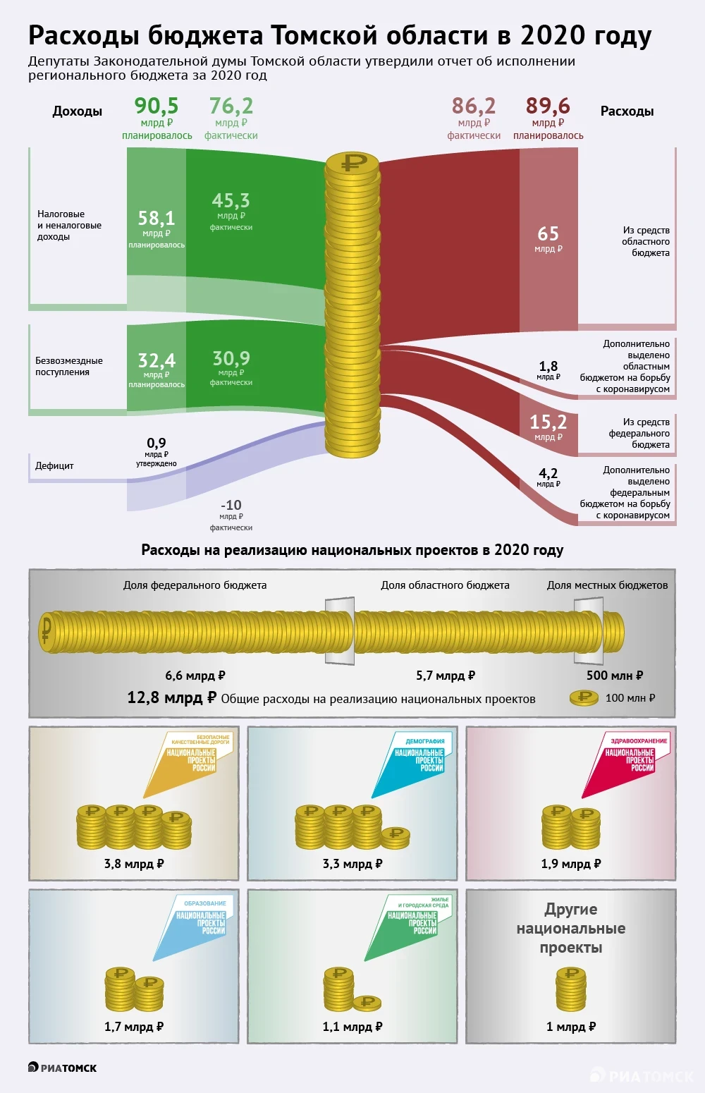 Власти Томской области в 2020 году направили на жизнедеятельность региона свыше 86 миллиардов рублей, из них 12,8 миллиарда – на реализацию нацпроектов. О том, как в структуре бюджета-2020 распределились доходы и расходы, – в инфографике РИА Томск.