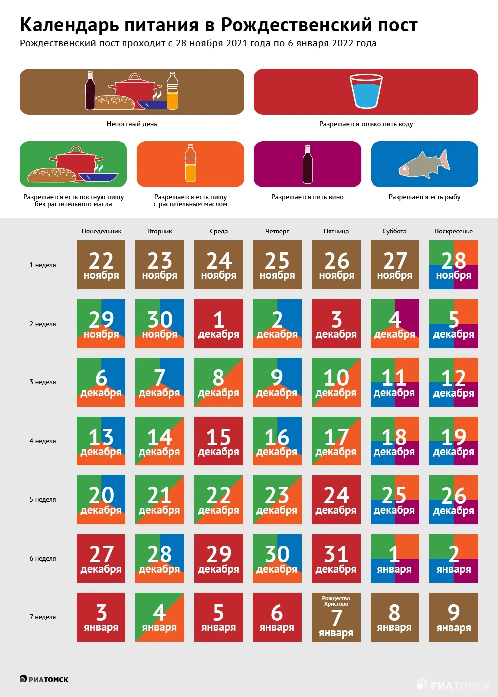 Рождественский пост, установленный в честь Рождества Христова, начался у православных 28 ноября и завершится 6 января. Пост довольно строгий в плане питания – верующие воздерживаются от мясных, молочных продуктов и яиц. Когда и какие продукты можно употреблять, смотрите в инфографике РИА Томск.