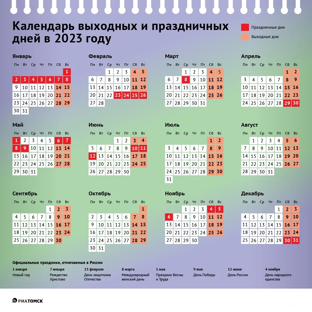 Минтруда РФ в четверг опубликовало проект постановления о переносе выходных и праздничных дней в 2023 году. На новогодние праздники россияне будут отдыхать девять дней (включая 31 декабря 2022 года), а на майские – в общей сложности семь. Как отдыхаем в 2023 году – в инфографике РИА Томск.