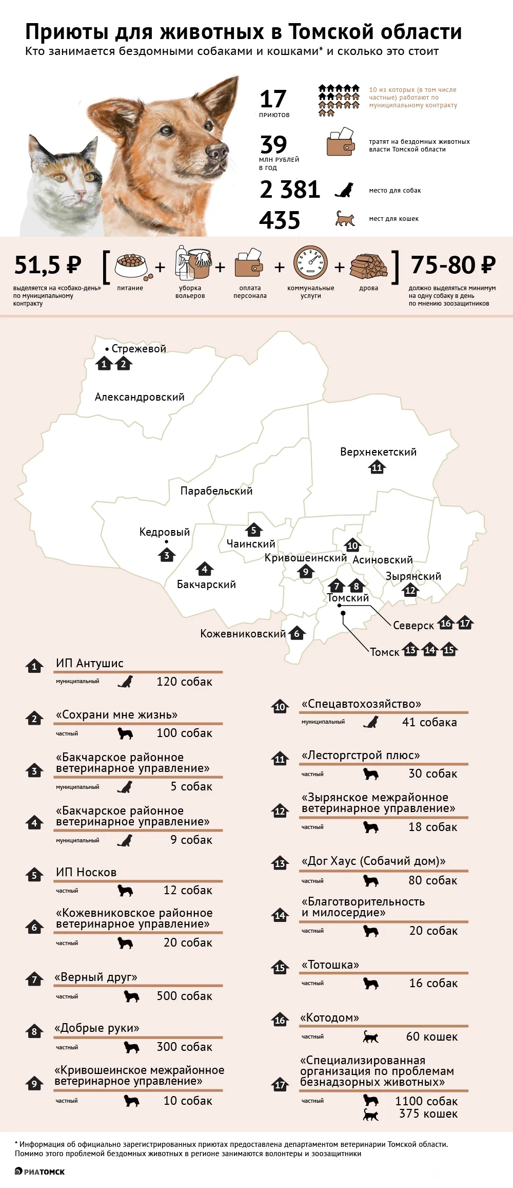 Семнадцать официальных приютов для бездомных кошек и собак действуют в Томской области, в них могут содержаться почти три тысячи животных. Где они расположены и во сколько обходятся бюджету – в инфографике РИА Томск.