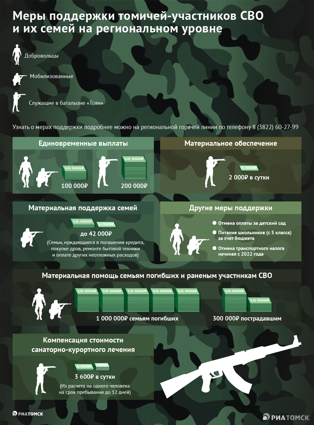 Мобилизованные томичи и добровольцы, участвующие в российской СВО на территории Украины, а также их семьи могут рассчитывать на материальную поддержку от Томской области. О том, какие выплаты и льготы официально действуют на региональном уровне, – в инфографике РИА Томск.