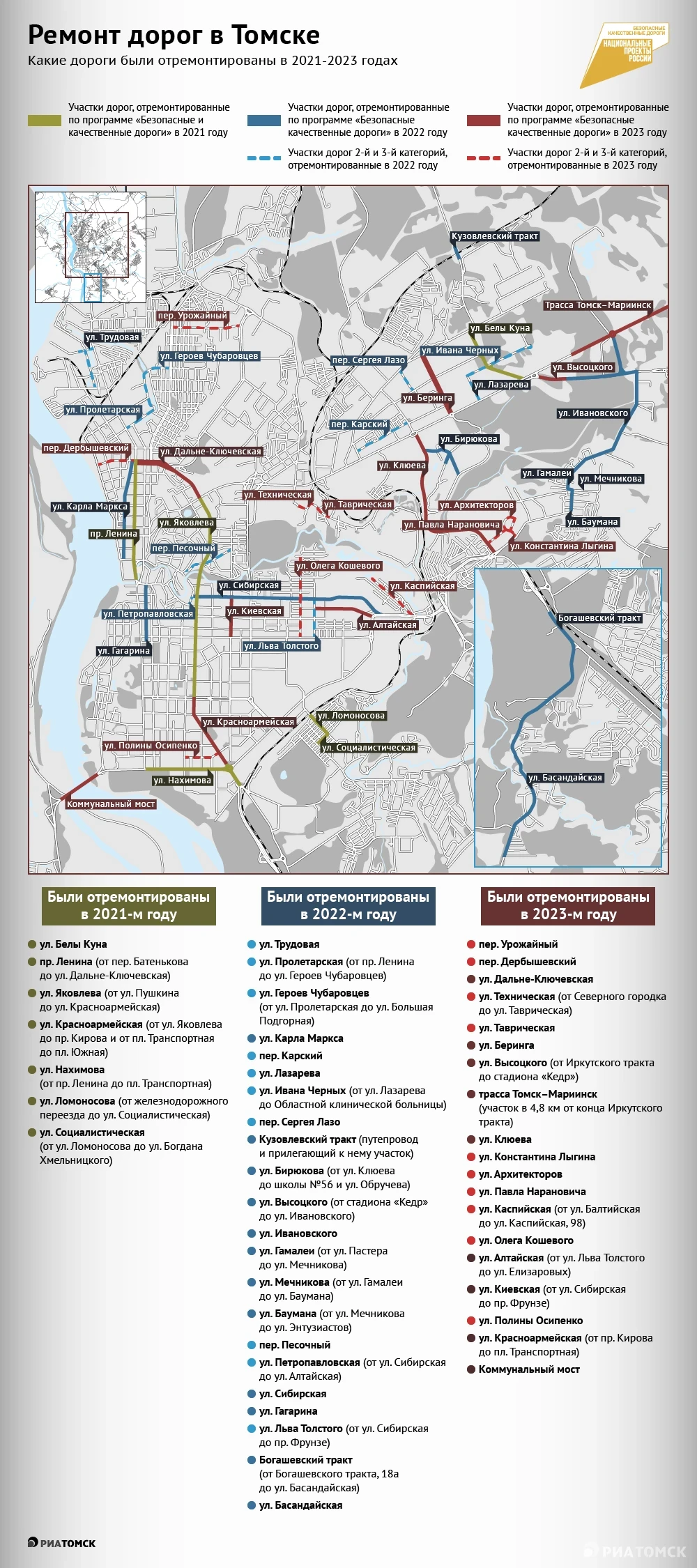 Подрядчики за лето 2023 года должны были отремонтировать в Томске 18 участков различных дорог. Из них восемь улиц – по нацпроекту, а остальные – в рамках программы по ремонту дорог второй и третьей категории. Какие магистрали были отремонтированы в городе с 2021 года – в инфографике РИА Томск.