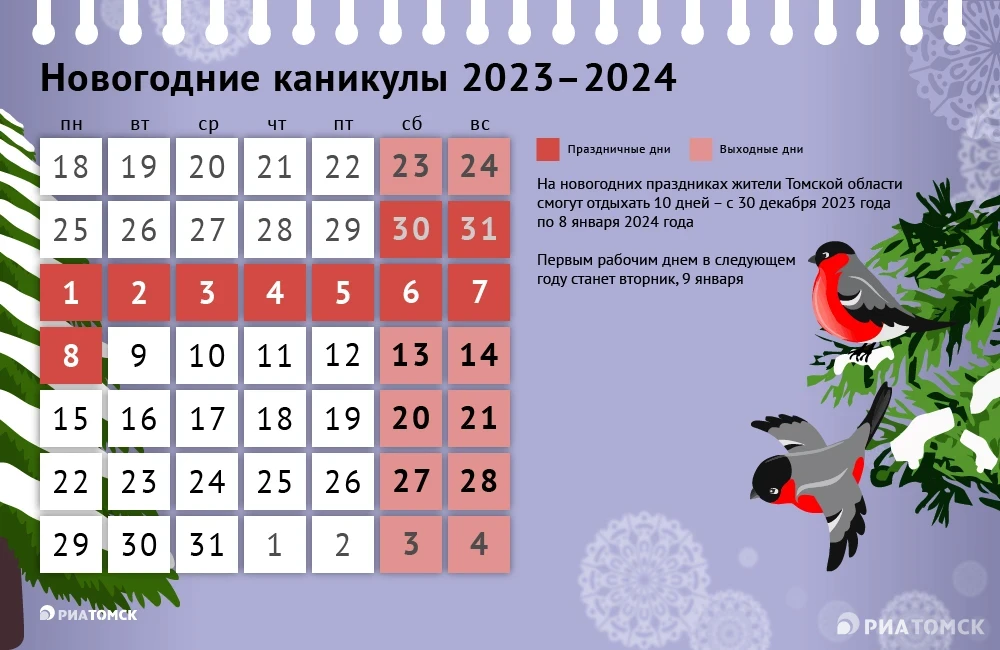 Томичи, как и все россияне, в предстоящие новогодние каникулы будут отдыхать 10 дней. Праздники начнутся уже с 30 декабря 2023 года, а выйти на работу предстоит 9 января 2024-го. Подробнее – в инфографике РИА Томск.