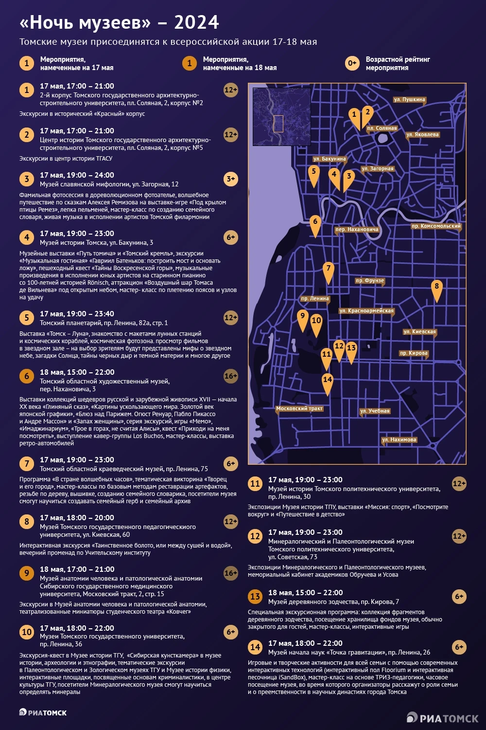 Всероссийская акция "Ночь музеев" пройдет в 2024 году 17 и 18 мая. Куда можно сходить в Томске и что можно там увидеть – в инфографике РИА Томск.