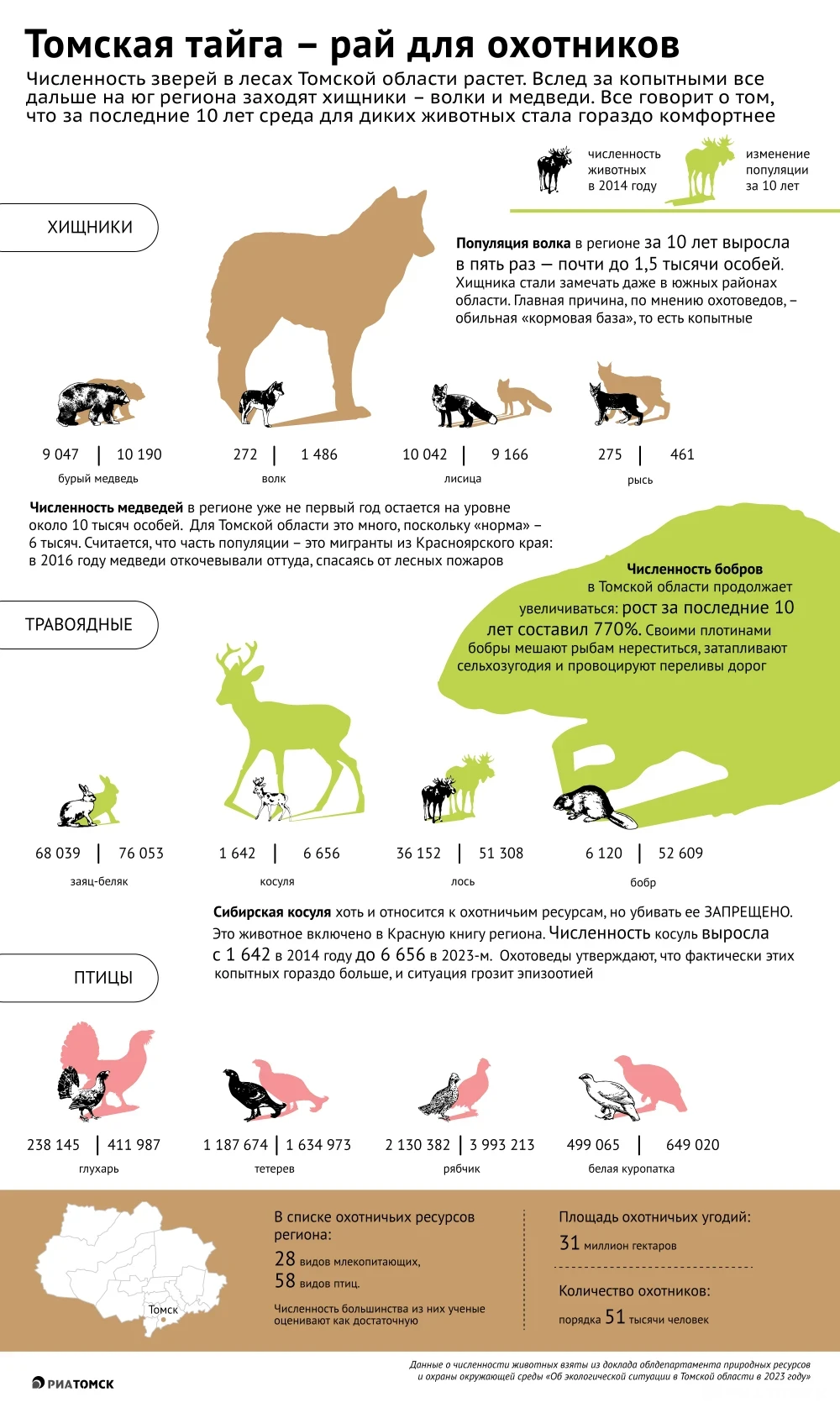 Популяции сразу нескольких видов диких животных выросли в разы в Томской области за последние 10 лет. В лидерах бобры и волки, но тревожит специалистов и ситуация с косулями. Подробнее о состоянии охотничьих ресурсов – в инфографике РИА Томск.
