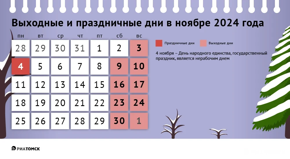 День народного единства в ноябре 2024 года выпадает на понедельник, однако три дня отдыха нам не светят: предпраздничная суббота – 2 ноября – будет рабочим днем. Наглядно о выходных и праздниках ноября – в календаре РИА Томск.