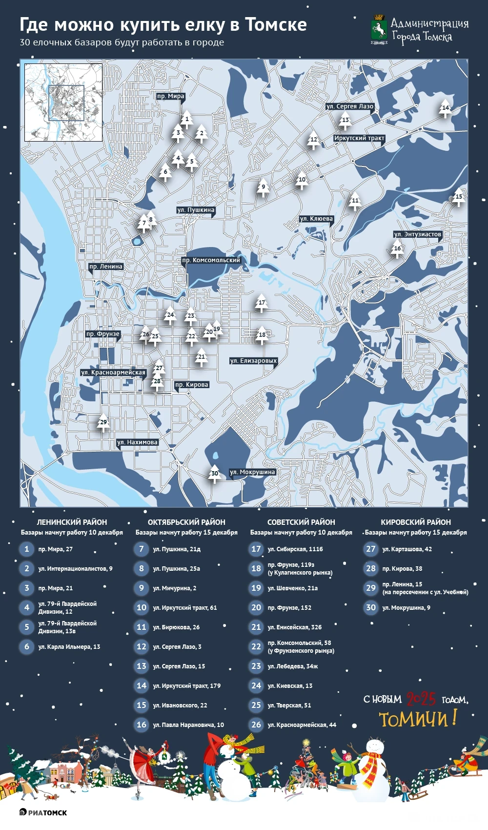 Торговля живыми елками может начаться в Томске уже 10 декабря. Администрации районов определили участки, где предприниматели могут открыть сезонные базары. По уточненным данным, всего их будет 30. Места и предполагаемые даты открытия – в инфографике РИА Томск.