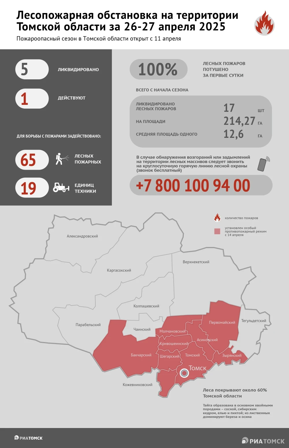 Шесть лесных пожаров зафиксировано в Томской области за прошедшие выходные, один из очагов пока не ликвидирован. Подробнее – в инфографике РИА Томск.